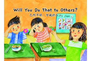 如果將「己所不欲,勿施於人」直接翻譯,就是「If you don't like something, don't giveit to others.」,也就是要「尊重他人,站在他人的立場思考」,因而取「Will You Do That toOthers ?」為英文題目。故事裡,Barren、A-Di 跟A-Mei 都同樣做了一件事:將不願意發生在自己身上的事情,卻在不尊重他人的情況下,對別人做出相同的舉動;把用過的髒衛生紙亂丟,把自己不喜歡的食物偷放到別人碗裡;明明是自己不能接受的事,卻沒有同理心的任意施加給其他人。共讀時,家長可以請孩子代入角色,讓他們想想,如果事情發生在他們身上,「Will You Do That to Others ?」