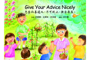 本文將「忠告而善道之」翻譯成「Give Your Advice Nicely」。說明給予別人建議時,重點在態度要「Nicely」。「Nicely」可以解釋為巧妙地、恰好地、謹慎地、令人愉快地,是否能做到「Give Your Advice Nicely」,是朋友是否接受建議的關鍵。繪本中老師告訴A-Fong,「It's not about what you said. It's about how you say it」,即使A-Fong 的說法正確,但因為A-Fong 對A-Di 和Susan 大吼大叫,態度粗魯又沒有禮貌,A-Di 和Susan 就不會想聽從A-Fong 的話。家長與孩子閱讀繪本時,可以讓孩子回憶自己和朋友的相處過程;並嘗試和孩子一同進行角色扮演,思考如果自己是A-Di 或Susan,面對A-Fong 的指責會有什麼心情?如果自己是A-Fong,怎麼勸告A-Di 和Susan 會比較好呢?