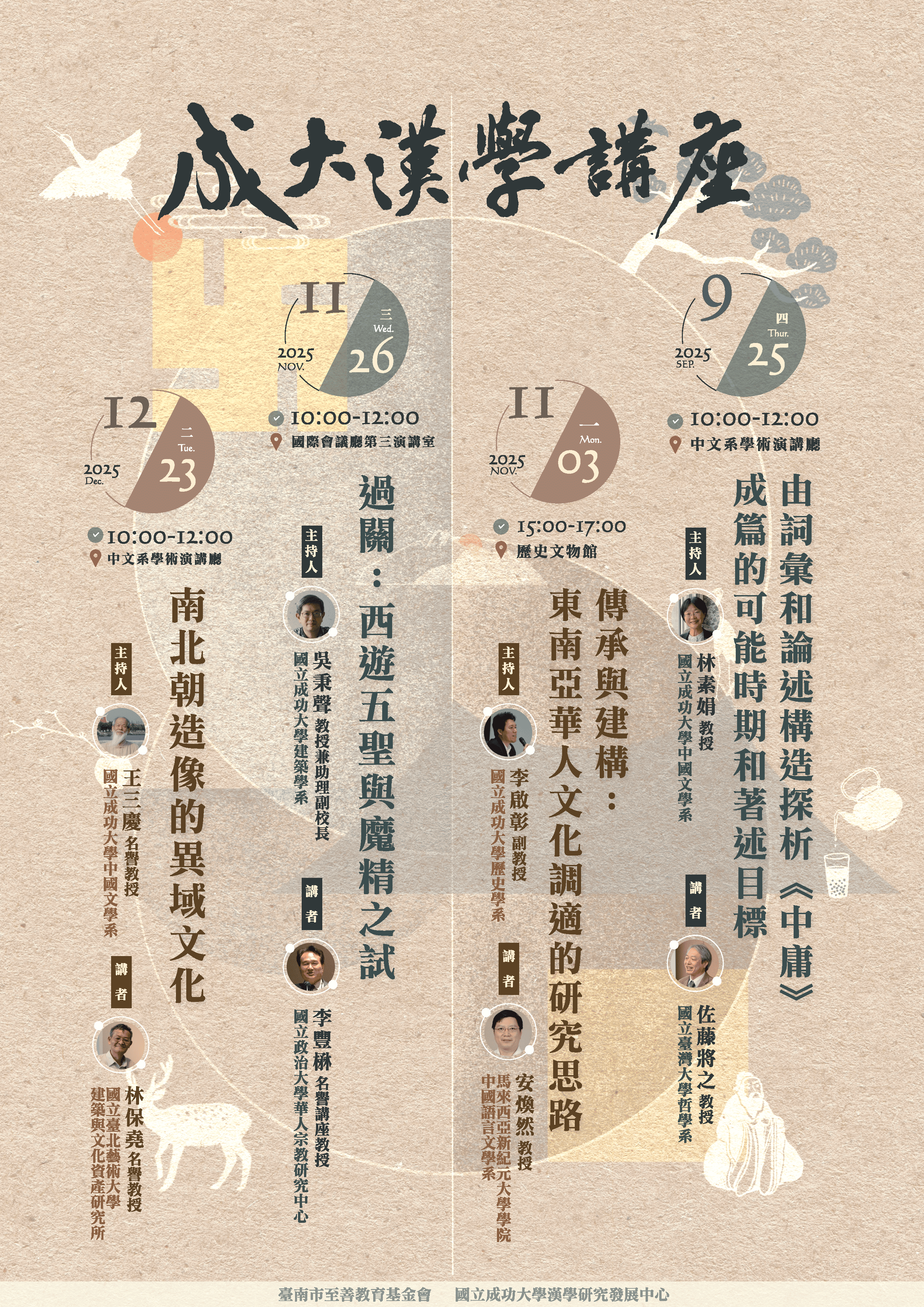 成大漢學講座,是由成大漢學研究發展中心規劃以「在地扎根、國際對話」為宗旨的專業跨域交流平台。旨在連結經典與當代,展現漢學研究之學理深度與社會連結;同時以「薪火相傳、文化轉譯」為核心意涵,邀集國內外標誌性學者,冀望將其具前瞻性的學術視野,與師生分享。本期規劃涵蓋思想與經學、史學與宗教、文學與藝術等類別之演講,特邀佐藤將之教授、安煥然教授、李豐楙院士、林保堯教授等頂尖學者,蒞臨現場演講。各場次資訊如下: