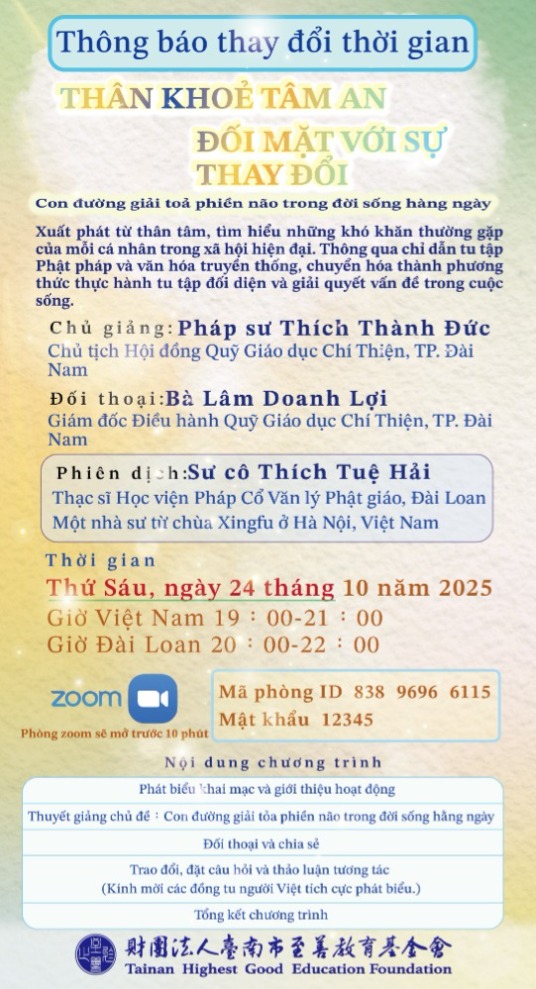 Buổi nói chuyện “THÂN KHOẺ TÂM AN – ĐỐI MẶT VỚI SỰ THAY ĐỔI: Con đường giải toả phiền não trong đời sống hàng ngày” dự kiến tổ chức vào thứ Sáu, ngày 26 tháng 9 năm 2025, từ 19:00–21:00 giờ Việt Nam (20:00–22:00 giờ Đài Loan), sẽ được hoãn lại vì lý do khách quan và được dời sang thứ Sáu, ngày 24 tháng 10 năm 2025, từ 20:00–22:00 giờ Đài Loan. Rất mong quý vị hoan hỷ thông cảm cho sự thay đổi này. Xin cảm ơn sự ủng hộ của quý vị và hẹn gặp lại trong buổi gặp gỡ trực tuyến sắp tới!