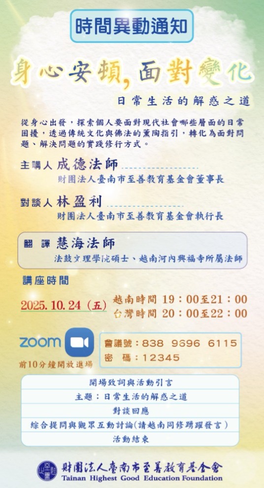原9月26日(五)越南時間19:00 至21:00(台灣時間20:00 至22:00)舉行「身心安頓,面對變化─日常生活的解惑之道」,因故改訂日期為2025 年10 月24 日(五)20:00 至22:00。不便之處,敬請見諒,感謝您的支持,並期待與您線上一聚!