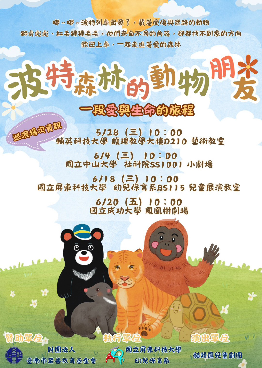 最後一場演出將於2025年6 月 20 日在成功大學鳳凰樹劇場登場,誠摯邀請家長與師長攜手孩子們到場與動物主角共享一段愛與勇氣的精彩旅程