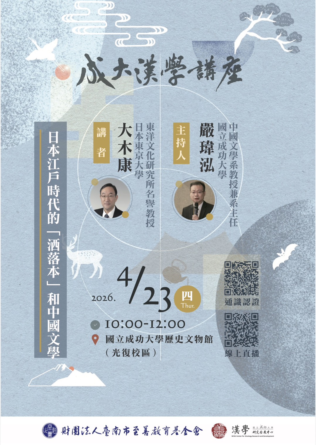 誠摯邀請關心日本文學、中國文學,以及對於日本江戶時代社會與文化感到興趣的師生踴躍參與。期待在大木康教授的引領之下,一同理解不同文化之間的對話與交融,並在重新審視「洒落本」與中國文學關係的過程中,激發更多深刻且富啟發性的思考。