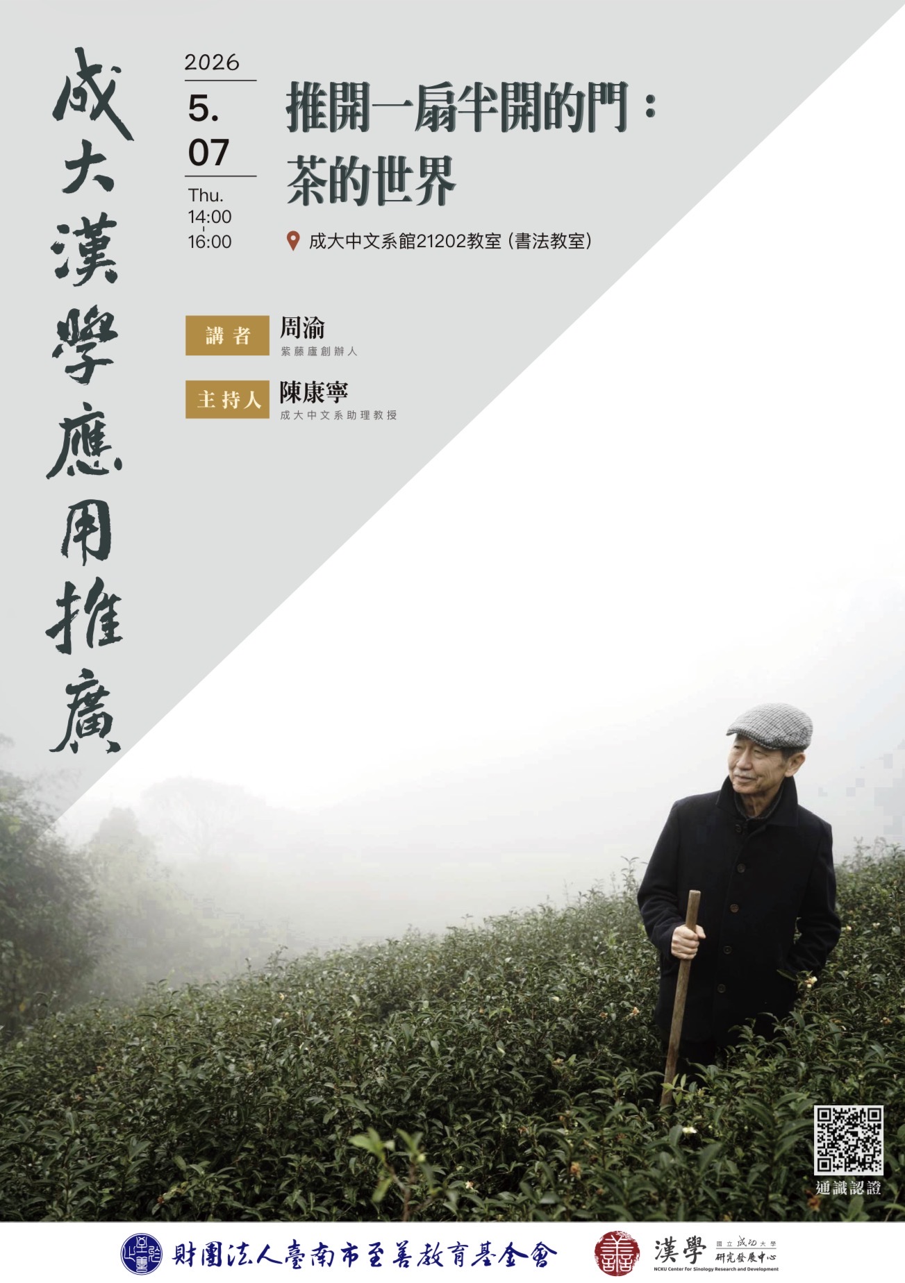 本次漢學推廣活動很榮幸邀請到紫藤廬創辦人周渝先生來主講,引領我們一起進入茶的世界。歡迎對茶文化有興趣,或想瞭解「茶」的當代意義的校園內外師生與大眾踴躍參與!