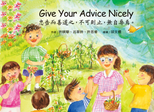 本文將「忠告而善道之」翻譯成「Give Your Advice Nicely」。說明給予別人建議時,重點在態度要「Nicely」。「Nicely」可以解釋為巧妙地、恰好地、謹慎地、令人愉快地,是否能做到「Give Your Advice Nicely」,是朋友是否接受建議的關鍵。繪本中老師告訴A-Fong,「It's not about what you said. It's about how you say it」,即使A-Fong 的說法正確,但因為A-Fong 對A-Di 和Susan 大吼大叫,態度粗魯又沒有禮貌,A-Di 和Susan 就不會想聽從A-Fong 的話。家長與孩子閱讀繪本時,可以讓孩子回憶自己和朋友的相處過程;並嘗試和孩子一同進行角色扮演,思考如果自己是A-Di 或Susan,面對A-Fong 的指責會有什麼心情?如果自己是A-Fong,怎麼勸告A-Di 和Susan 會比較好呢?