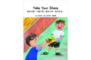 「Take your share」意思是「拿你自己應該拿的那一份。」繪本中A-Di 看到喜歡的餅乾,只想自己享用;看到新的玩具就搶走,看到喜歡的書就搶走;看到愛吃的蛋糕就多夾一塊。只要想要,就要得到,永遠不覺得滿足,也感受不到自己行為的魯莽、無禮。直到某天他的貪心讓他吃壞肚子,在這樣的痛苦中,他才感到自作自受,才懂反省。家長與孩子共讀時,可以讓孩子試著思考:當A-Di搶走自己的東西時,自己會怎麼想?如果自己是A-Di,在每個情境裡,又可以怎麼做?如果大家都知道「拿自己應該拿的那一份」,又會發生什麼事?不需要對答案設限,從孩子身上,說不定能獲得許多意料外的驚喜!